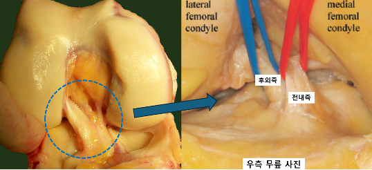 조금 더 세분하게 구조를 나누어보자면, 전방십자인대는 크게 2개의 다발로 이루어져 있습니다. 전내측와 후외측, 두개의 다발이 서로 만나서 하나의 인대를 이루고 있는데요, 생역학적으로 전내측은 무릎의 앞뒤로 흔들 때 안정성을, 후외측은 무릎의 회전력에 안정성을 더 주도적으로 부여하는 것으로 알려져 있습니다.