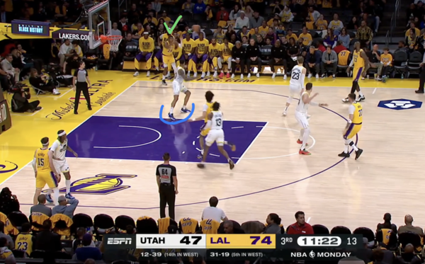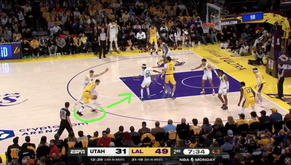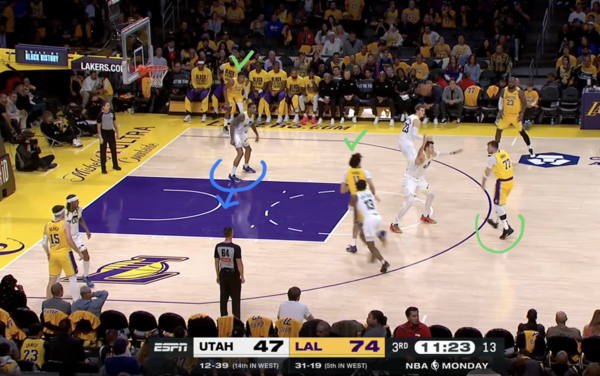 위 장면처럼 유타의 수비 실수(2명의 수비수가 스크램 스위치를 위해 페인트존에 동시에 머물고 말았다)가 벌어지면 이를 어김없이 크로스 패스로 공략했다.