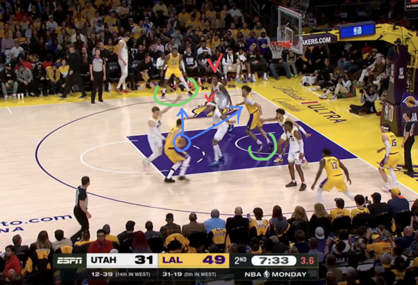 돈치치가 순식간에 페인트존으로 진입하면서 유타 수비수(붉은 체크)들이 딜레마에 빠진다.