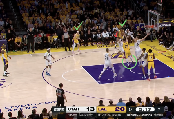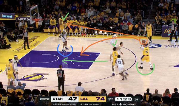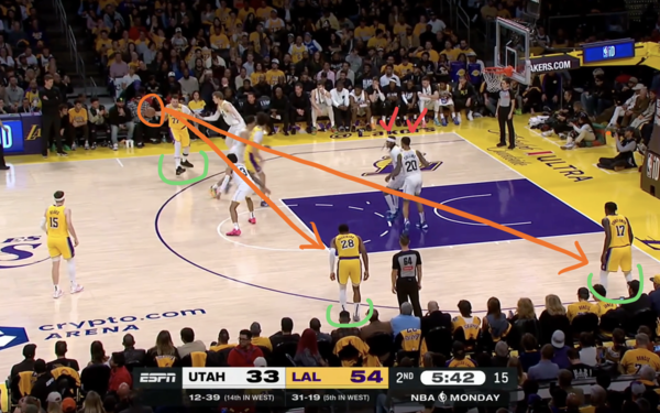 돈치치와 잭슨 헤이즈가 탑에서 2대2를 시작한다. 다른 레이커스 선수 3명은 모두 베이스라인의 코너와 덩커스팟에 붙어, 돈치치-헤이즈의 2대2를 위한 공간을 노골적으로 만들어준다.
