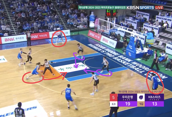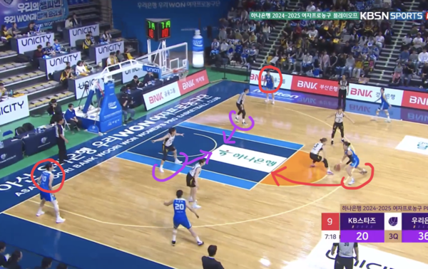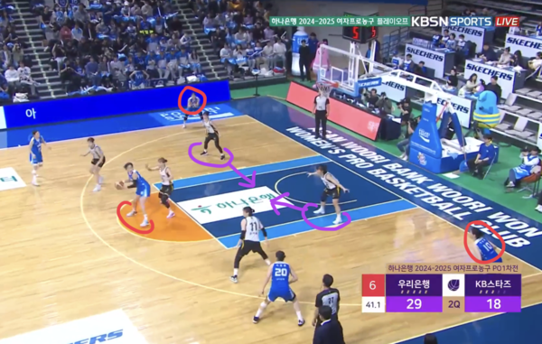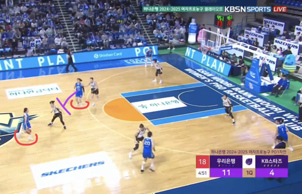 그리고 이에 대해 KB는 우리은행의 양쪽 코너맨을 마크하는 송윤하와 강이슬이 코너맨과 거리를 두고 로우 포스트에 위치, 김단비의 돌파를 막기 위한 헬프를 준비한다.