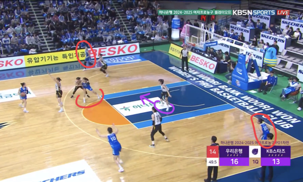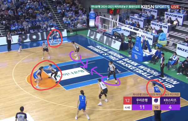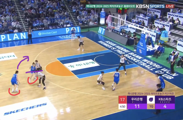 이 장면 후에도 KB는 계속 블리츠 수비를 시도했고, 당황한 우리은행의 턴오버를 유발했다.