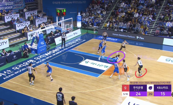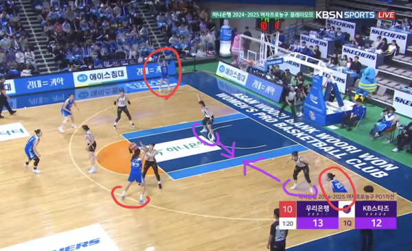 이 경우 송윤하가 막고 있던 왼쪽 코너맨이 오픈 상태가 되는데, 이 상황에서 KB의 수비 로테이션은 왼쪽 윙의 이윤미(6번)가 자신이 본래 막고 있던 한엄지(3번)와 우리은행의 왼쪽 코너맨 사이에서 겟 투(get two, 2명의 볼 없는 공격수를 동시에 체크하는 것) 수비를 펼치다가 코너로 달려가는 것이다.