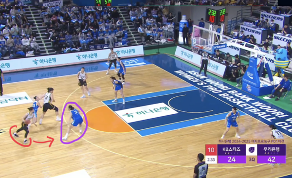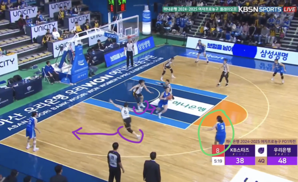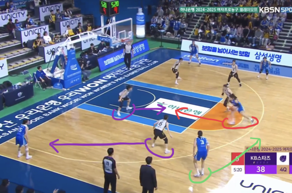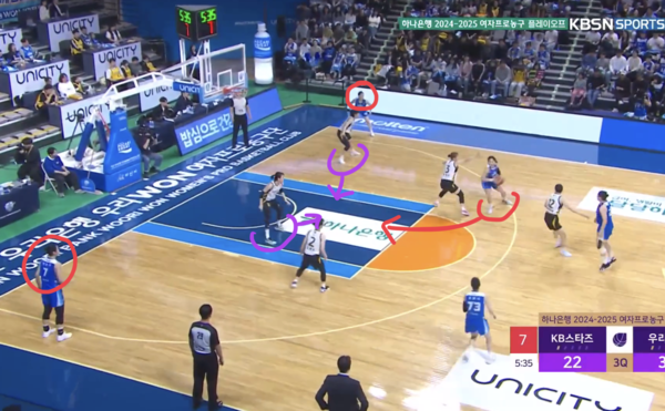 위 장면을 보면 김단비가 아이솔레이션을 통해 왼쪽 돌파를 시도하는 순간, 왼쪽 45도에 있던 한엄지(3번)가 탑으로 이동해 KB의 로테이션 수비를 꼬이게 만드는 것을 확인할 수 있다.