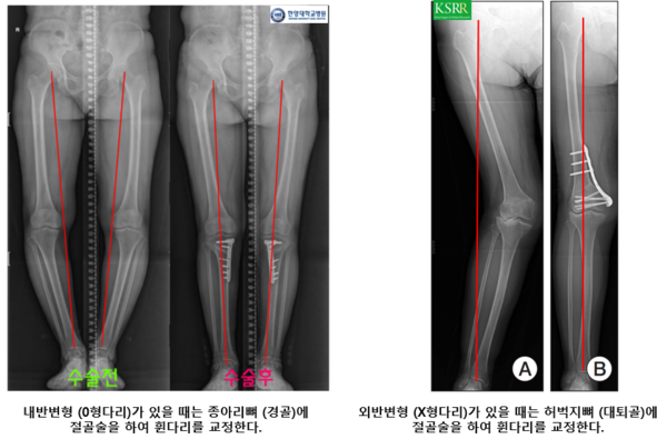 엠비드의 경우 골반쪽 뼈라고 기사에 나왔는데 아마도 허벅지뼈(대퇴골)을 이야기하는 것 같았습니다. 일반적으로 내반변형 일때는 종아리뼈(경골)에 절골술을 시행하여 교정하고, 외반변형일때는 허벅지뼈에 절골술을 하는 것이 일반적입니다.
