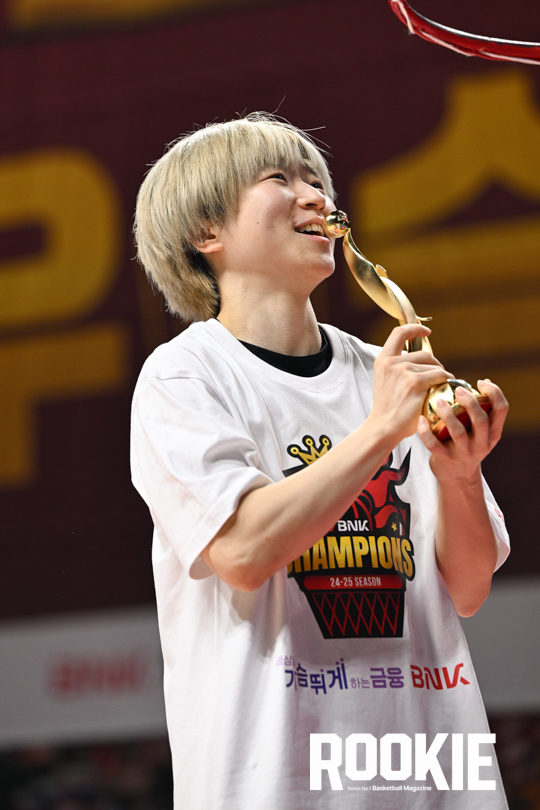 20일 부산 사직체육관에서 ‘하나은행 2024~2025 여자프로농구’ 부산 BNK썸과 아산 우리은행의 챔피언결정전 3차전 경기가 열렸다. BNK썸이 접전 끝에 55:54로 승리하여 창단 첫 우승을 차지하였다. MVP를 차지한 안혜지가 포즈를 취하고 있다.