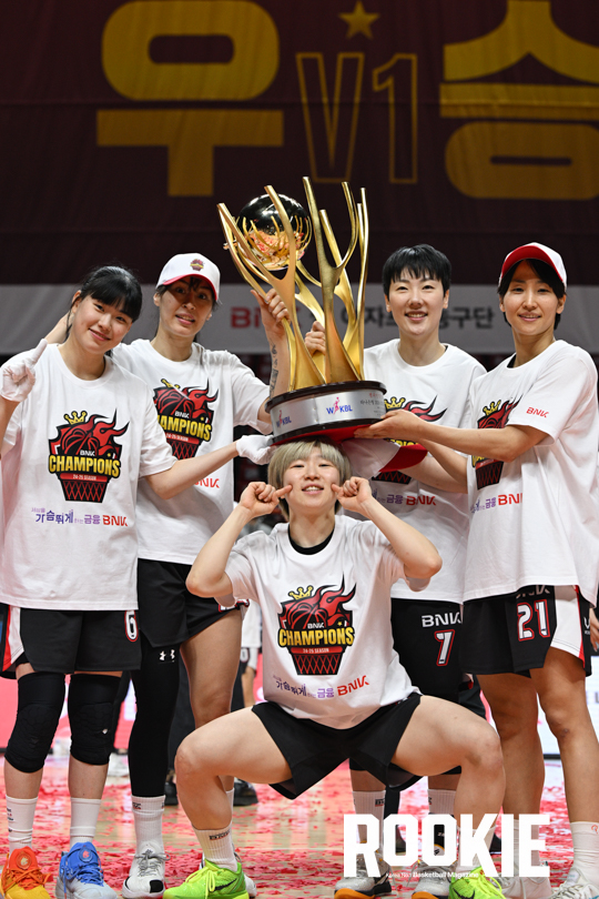 20일 부산 사직체육관에서 ‘하나은행 2024~2025 여자프로농구’ 부산 BNK썸과 아산 우리은행의 챔피언결정전 3차전 경기가 열렸다. BNK썸이 접전 끝에 55:54로 승리하여 창단 첫 우승을 차지하였다. 우승으로 이끈 BNK썸 best5 선수들이 트로피와 함께 포즈를 취하고 있다.