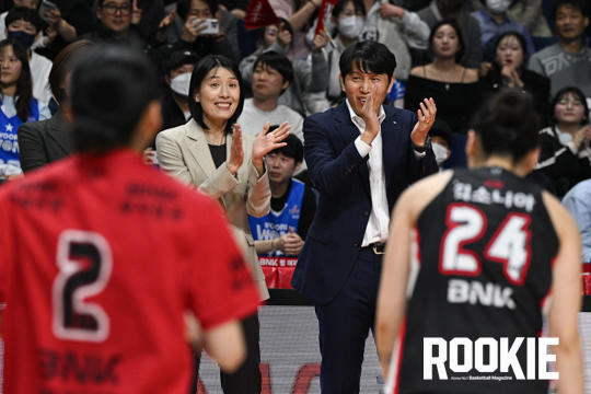 20일 부산 사직체육관에서 ‘하나은행 2024~2025 여자프로농구’ 부산 BNK썸과 아산 우리은행의 챔피언결정전 3차전 경기가 열렸다. BNK썸이 접전 끝에 55:54로 승리하여 창단 첫 우승을 차지하였으며, 우리은행 위성우 감독과 전주원 코치가 상대의 우승을 축하하고 있다.