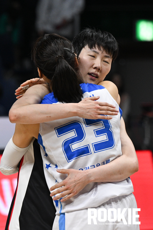 20일 부산 사직체육관에서 ‘하나은행 2024~2025 여자프로농구’ 부산 BNK썸과 아산 우리은행의 챔피언결정전 3차전 경기가 열렸다. BNK썸이 접전 끝에 55:54로 승리하여 창단 첫 우승을 차지하였으며, 지난시즌까지 한솥밥을 먹었던 BNK썸 박혜진과 우리은행 김단비가 포옹을 하고 있다.