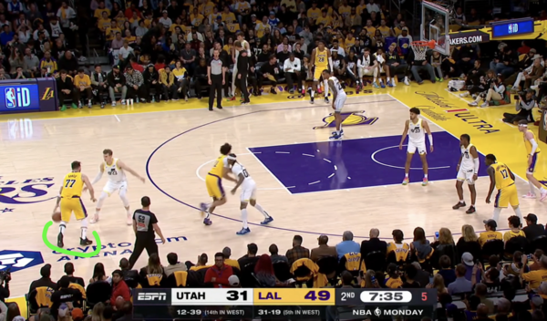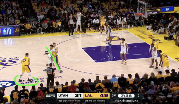 1. 돈치치와 잭슨 헤이즈가 탑에서 2대2를 시작한다. 다른 레이커스 선수 3명은 모두 베이스라인의 코너와 덩커스팟에 붙어, 돈치치-헤이즈의 2대2를 위한 공간을 노골적으로 만들어준다.