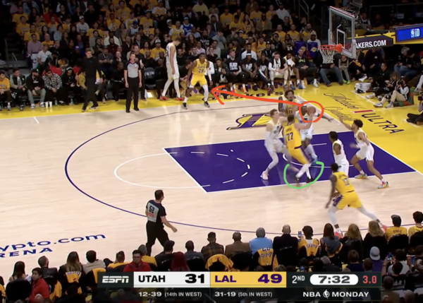 5. 결국 존 콜린스는 림을 먼저 보호하기 위해 페인트존으로 깊게 처진다. 이때 돈치치의 모습을 보자. 조급하게 판단을 내리기보다는 공을 캐치하고 한 손에 들고 레이업 스텝을 밟으며 유타 수비를 페인트존으로 끝까지 몰아넎는 모습이다. 덕분에 왼쪽 코너의 하치무라 루이가 완벽한 오픈 상태가 됐다.