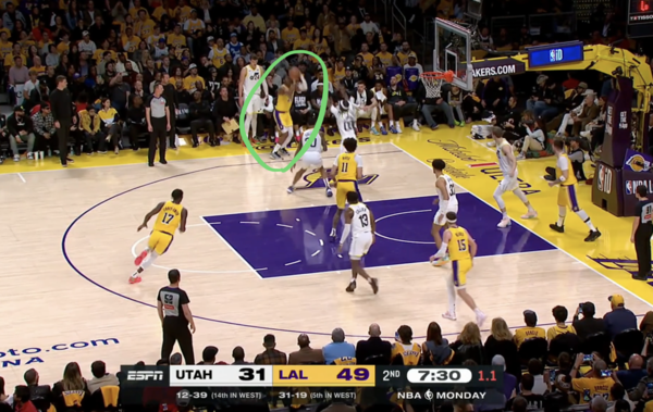 2. 유타가 스위치 수비로 대응한다. 스위치로 돈치치에게 붙은 라우리 마카넨의 수비 스탠스를 보면 돈치치를 미들 라인보다는 사이드 라인 쪽으로 몰려는 의도가 보인다. 돈치치에게 스크린을 걸어줬던 잭슨 헤이즈는 빠르게 림 쪽으로 이동, 돈치치를 위해 공간을 비워주는 모습이다.