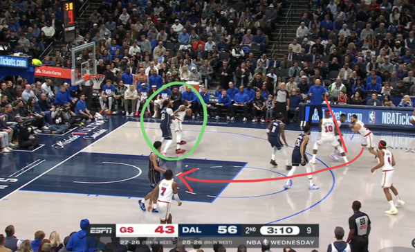 4. 골든스테이트의 포스트 스플릿 액션은 여기서 끝나지 않는다. 이번엔 반대 사이드 로우 포스트의 드레이먼드 그린에게 볼을 투입한다.