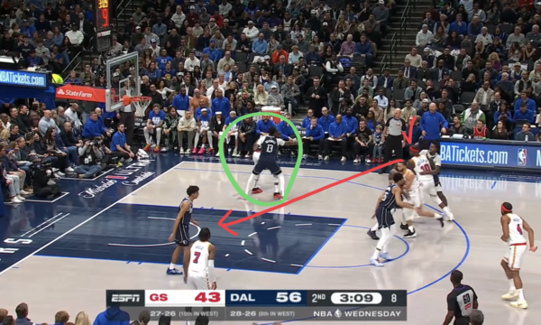 4. 돈치치가 순식간에 페인트존으로 진입하면서 유타 수비수(붉은 체크)들이 딜레마에 빠진다. 스크린 후 림 근처로 이동한 잭슨 헤이즈(오른쪽 초록색 원)와 왼쪽 코너에 자리를 잡고 공간을 벌려주던 하치무라 루이(왼쪽 초록색 원)가 모두 돈치치의 패스를 받을 수 있기 때문이다.