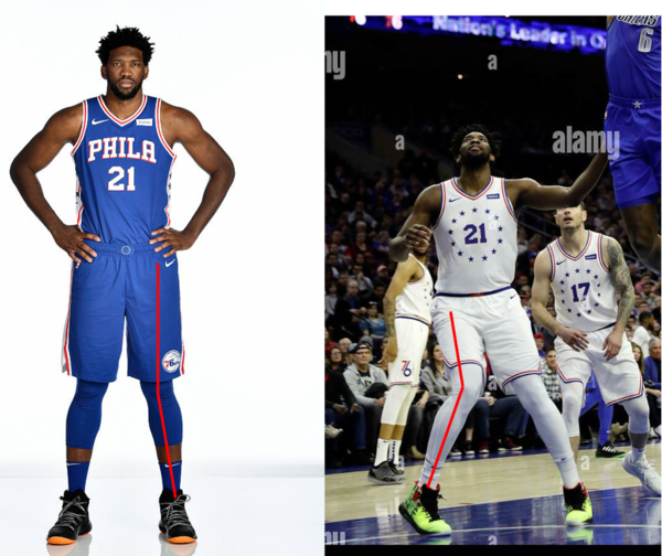 엠비드의 영상이나 사진들을 보면 무릎의 외반 변형이 자주 관찰되었습니다. 제가 정형외과 의사이다보니 농구를 볼 때 플레이 뿐만 아니라 선수들의 특성들도 눈에 들어옵니다. 사진처럼 엠비드는 정적인 상태나 동적인 상태에서 일관적으로 외반변형(X자 다리)가 관찰됩니다. 이 외반변형은 제가 과거 전방십자인대 부상 기사에서도 언급해드린 것 처럼 무릎 부상의 위험 요인입니다. 또한 기사에 따르면 엠비드는 과거 외측 반월 연골판 수술을 받은 것으로 알려져 있습니다. 그렇기 때문에 외측에 병변이 있는 상태에서 외반 변형으로 인한 부담이 높아져 있어, 외측반월 연골판 봉합술 후 회복이 잘 되지 않았을 가능성이 있습니다. 그렇기 때문에 절골술을 고려하는 것으로 추측됩니다.