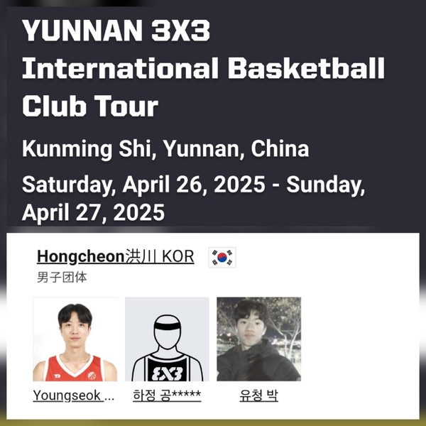 이영석, 공하정(이상 홍천), 박유청(김포시농구협회)이 26일과 27일 이틀간 중국 쿤밍에서 열리는 '윈난 3x3 인터내셔녈 농구 클럽 투어'에 참가한다. 3명의 선수는 대회 개최 하루 전 출전을 요청받고, 출전을 결정했다. 평소라면 있을 수 없는 일이지만, 3명의 선수들은 한국과 중국의 신뢰 관계를 위해 대회 당일 중국으로 출국하는 모험을 감행했다.