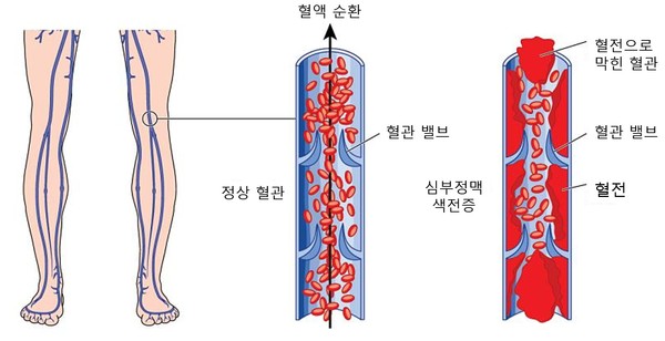 심부정맥 혈전증(Deep Vein Thrombosis)은 동맥에서 말초 미세혈관을 지나 정맥을 통해 심장으로 다시 돌아가야 하는 혈류 경로에서, 정맥이 손상되거나 혈액이 정체되어 순환하지 않게 되면 혈액이 응고되어 ‘혈전’(피떡)이 생기는 질환입니다.