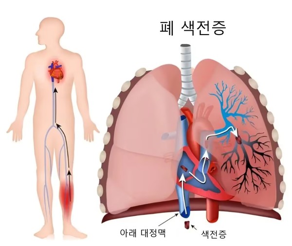 말초혈관에서 산소를 소비한 혈액, 즉 정맥혈은 이산화탄소와 산소를 교환하기 위해 항상 폐로 향합니다. 이때 혈전이 폐를 막아버리면 폐의 기능이 급격히 떨어지고, 심각할 경우 사망에 이를 수 있을 정도로 치명적일 수 있습니다.