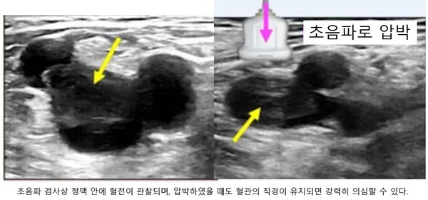 근육, 인대 손상뿐 아니라 혈관 검사에도 많은 도움이 되며, 혈전증이 의심될 때 혈관을 눌러보아 혈관이 제대로 눌리지 않고 두께가 유지된다면, 그 안에 무엇인가가 존재한다고 강하게 의심할 수 있습니다.