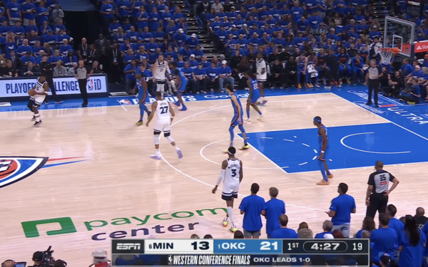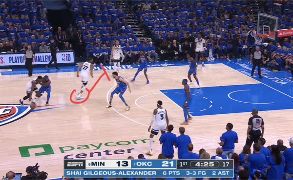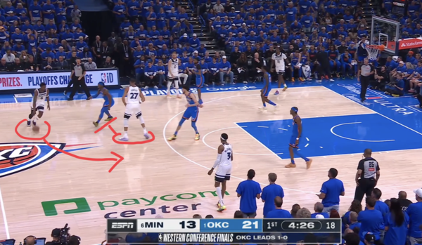 4. 디빈첸조가 고베어의 스크린을 받아 위로 올라오고, 에드워즈가 디빈첸조에게 패스하며 공격이 이어진다.