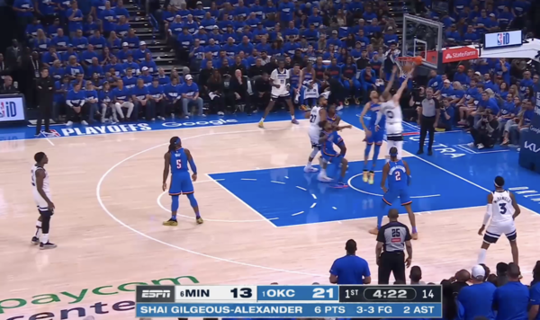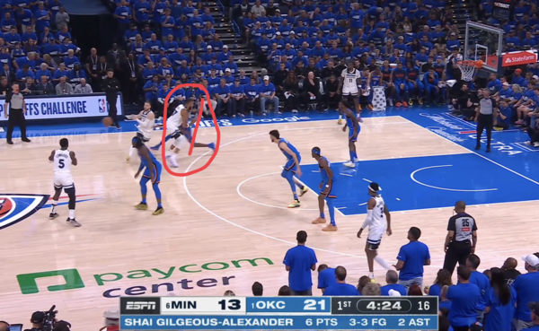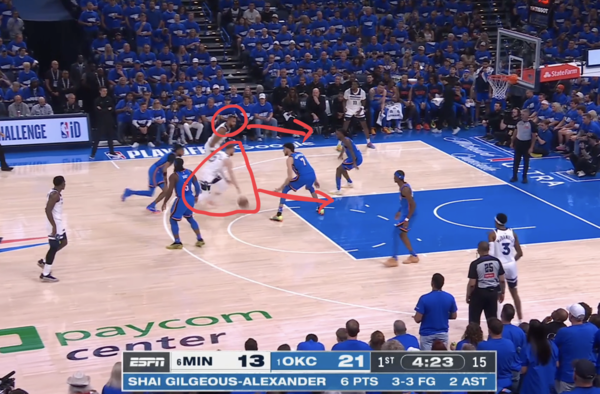 6. 홈그렌이 고베어와 디빈첸조를 동시에 체크해야 하는 딜레마에 빠지고, 결국 이를 이용해 디빈첸조가 돌파 득점을 만들어낸다.
