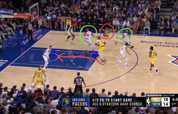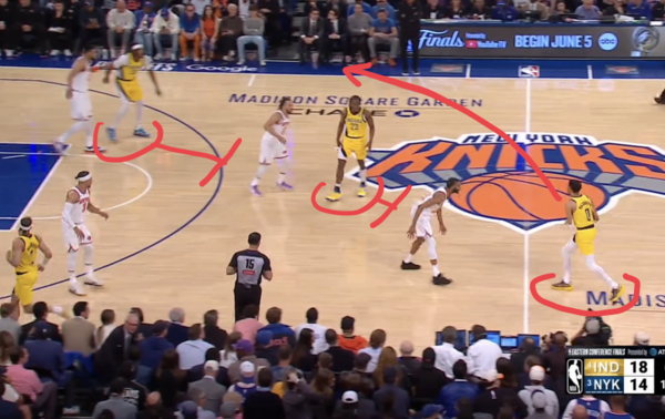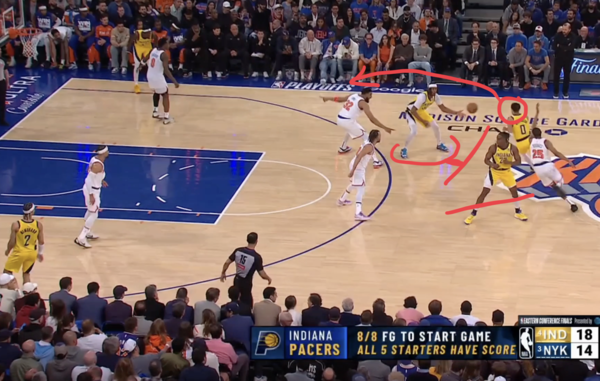 5. 터너의 핸드오프 패스를 받은 할리버튼이 가속을 하며 미드레인지로 진입, 자신을 막던 핸들러 수비수를 뒤에 두고 터너를 막던 빅맨 수비수는 바로 앞에 둔다. 핸드오프 패스를 한 터너는 림으로 대시한다.