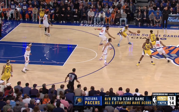 1. 할리버튼이 볼을 몰고 넘어오며 인디애나의 공격이 시작된다.