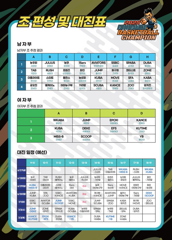 6월 27일부터 7일 6일까지 열흘간 국민대학교 체육관에서 열리는 국민대학교 총장배 전국 아마추어 농구대회는 금년에도 남자부 32개팀, 여자부 11개팀 총 43개팀이 참가한다.