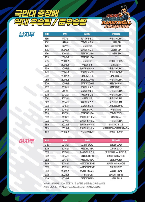 벌써 41회째를 맞이하는 국민대 총장배 농구대회는 순수 아마추어 대학생만 참가하는 대회로 세련된 대회 운영과 수준 높은 경기력으로 정평이 나 있다.