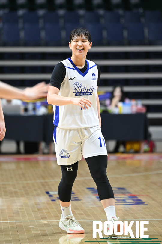 2일 부산에 위치한 사직실내체육관에서 ‘2025 티켓링크 WKBL 퓨처스리그’ 인천 신한은행과 몽골의 경기가 열렸다. 신한 허유정이 연이어 3점슛을 성공하고 웃고 있다.