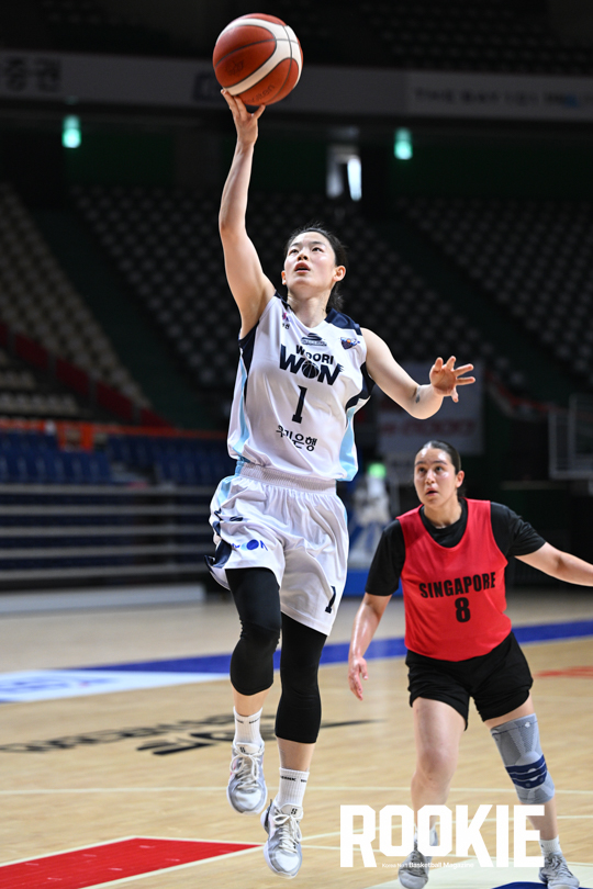 3일 부산에 위치한 사직실내체육관에서 ‘2025 티켓링크 WKBL 퓨처스리그’ 아산 우리은행 싱가포르의 경기가 열렸다. 우리은행 강계리가 레이업 슛을 시도하고 있다.