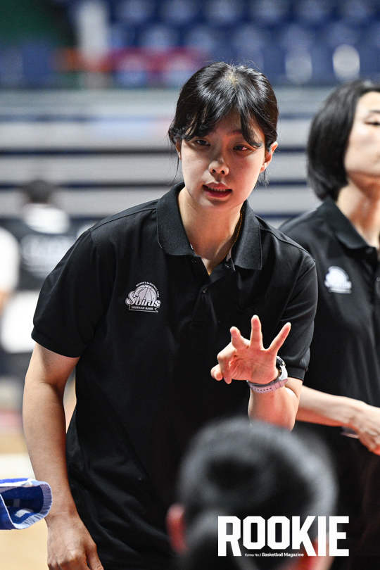 4일 부산에 위치한 사직실내체육관에서 ‘2025 티켓링크 WKBL 퓨처스리그’ 인천 신한은행 도쿄 하네다의 경기가 열렸다. 신한은행 이경은 코치가 작전을 지시하고 있다.
