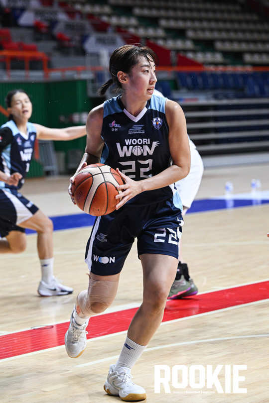 4일 부산에 위치한 사직실내체육관에서 ‘2025 티켓링크 WKBL 퓨처스리그’ 일본 JUBF와 아산 우리은행의 경기가 열렸다. 우리은행 편선우가 패스할 곳을 찾고 있다.