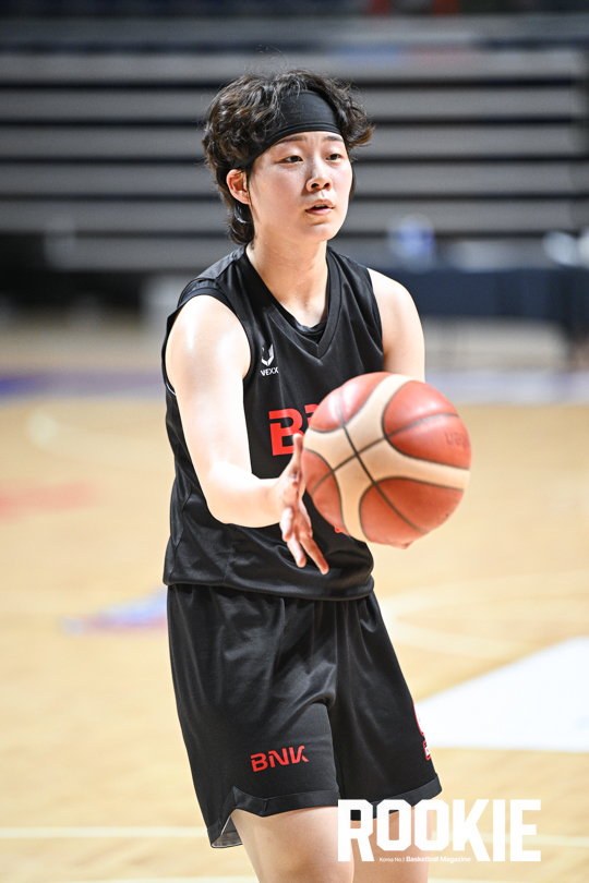 5일 부산에 위치한 사직실내체육관에서 ‘2025 티켓링크 WKBL 퓨처스리그’ 싱가포르와 부산 BNK썸의 경기가 열렸다. BNK썸 김보현이 패스를 받고 있다.