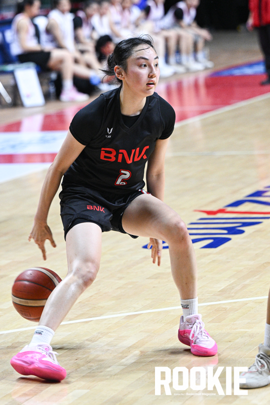 5일 부산에 위치한 사직실내체육관에서 ‘2025 티켓링크 WKBL 퓨처스리그’ 싱가포르와 부산 BNK썸의 경기가 열렸다. BNK썸 최서연이 드리블을 하고 있다.
