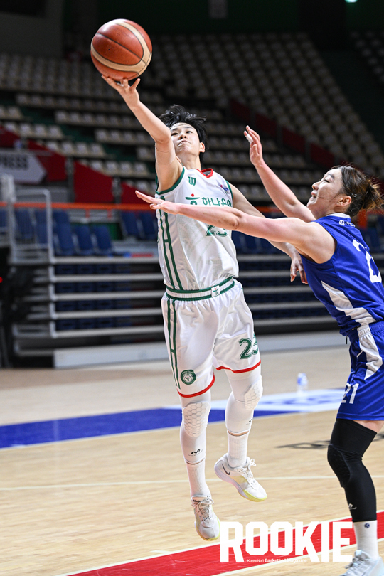 5일 부산에 위치한 사직실내체육관에서 ‘2025 티켓링크 WKBL 퓨처스리그’ 부천 하나은행과 인천 신한은행의 경기가 열렸다. 하나은행 박진영이 골밑 공격을 시도하고 있다.