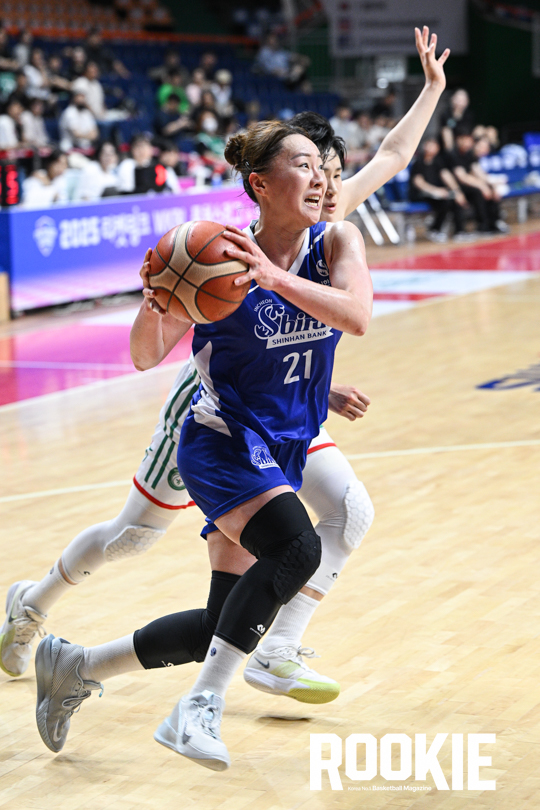 5일 부산에 위치한 사직실내체육관에서 ‘2025 티켓링크 WKBL 퓨처스리그’ 부천 하나은행과 인천 신한은행의 경기가 열렸다. 신한은행 김진영이 골밑 돌파를 시도하고 있다.