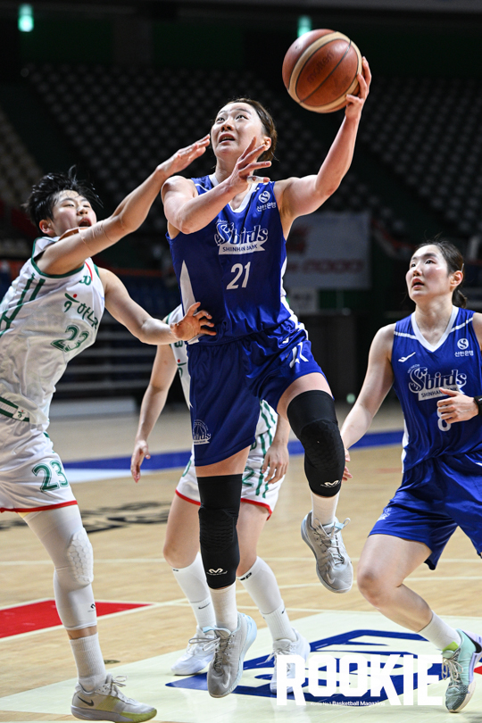 5일 부산에 위치한 사직실내체육관에서 ‘2025 티켓링크 WKBL 퓨처스리그’ 부천 하나은행과 인천 신한은행의 경기가 열렸다. 신한 김진영이 골밑 공격을 시도하고 있다.