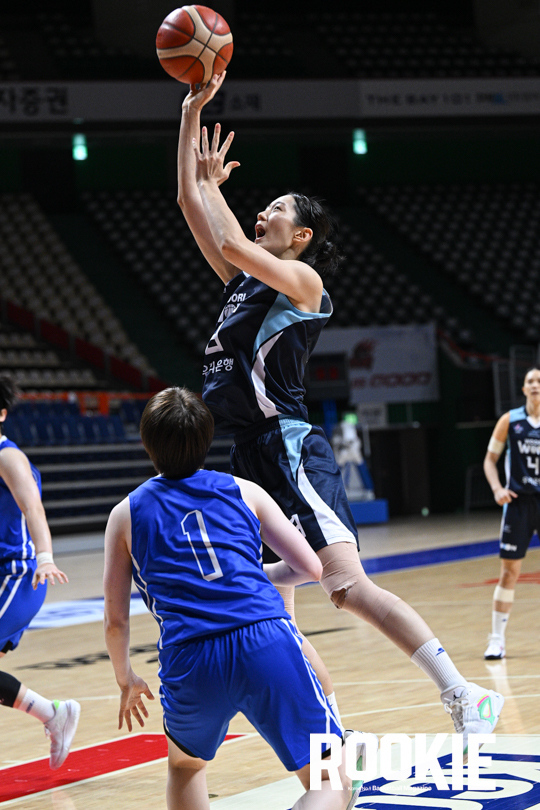 5일 부산에 위치한 사직실내체육관에서 ‘2025 티켓링크 WKBL 퓨처스리그’ 용인 삼성생명과 아산 우리은행의 경기가 열렸다. 우리은행 오승인이 골밑 공격을 시도하고 있다.