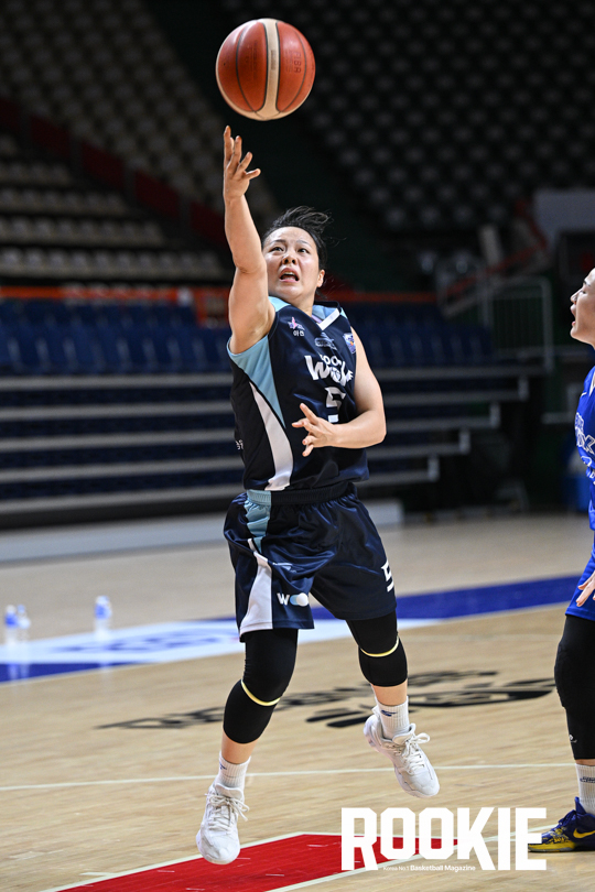 5일 부산에 위치한 사직실내체육관에서 ‘2025 티켓링크 WKBL 퓨처스리그’ 용인 삼성생명과 아산 우리은행의 경기가 열렸다. 우리은행 심성영이 골밑 공격을 시도하고 있다.