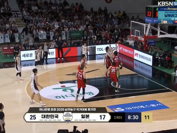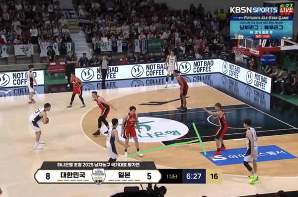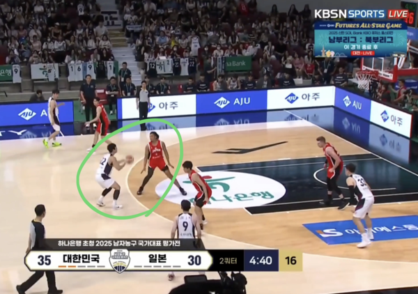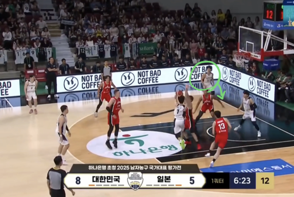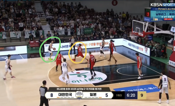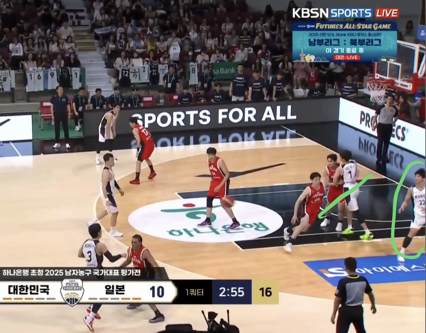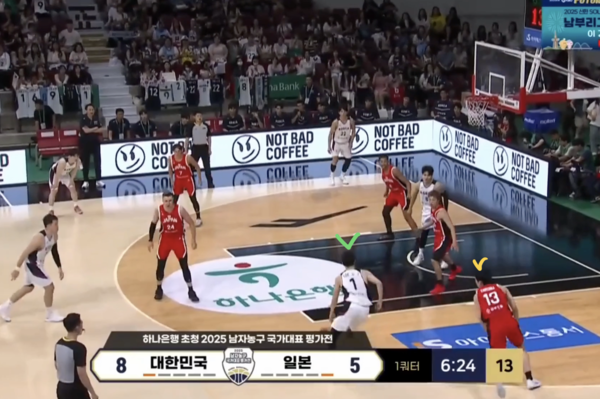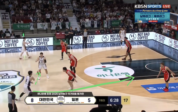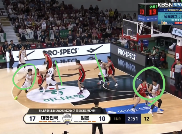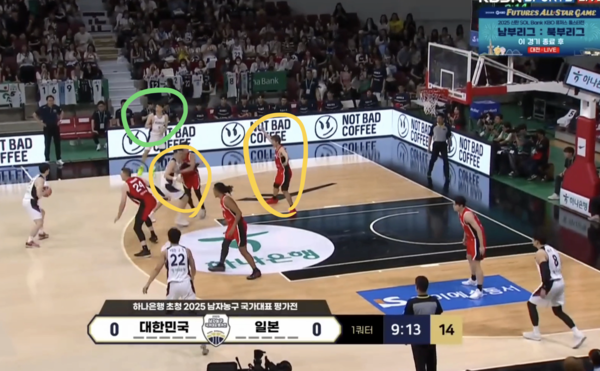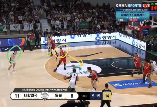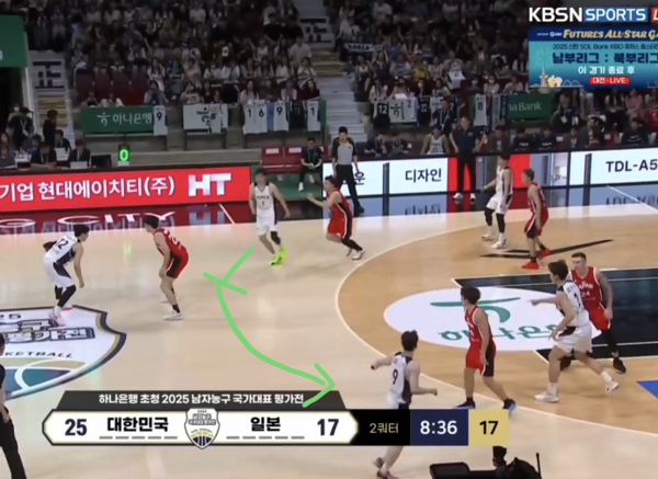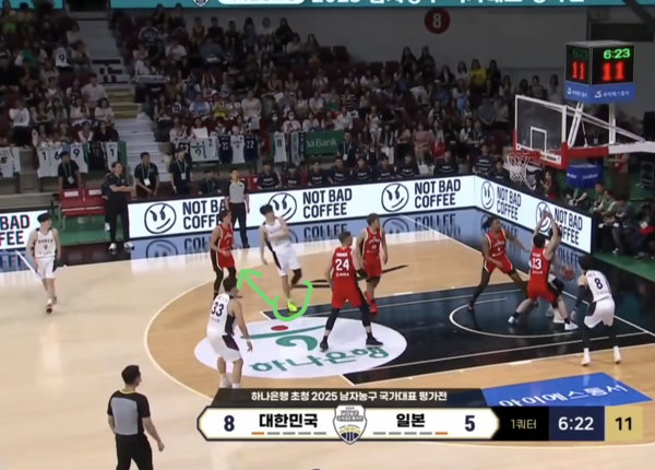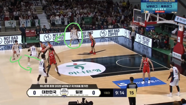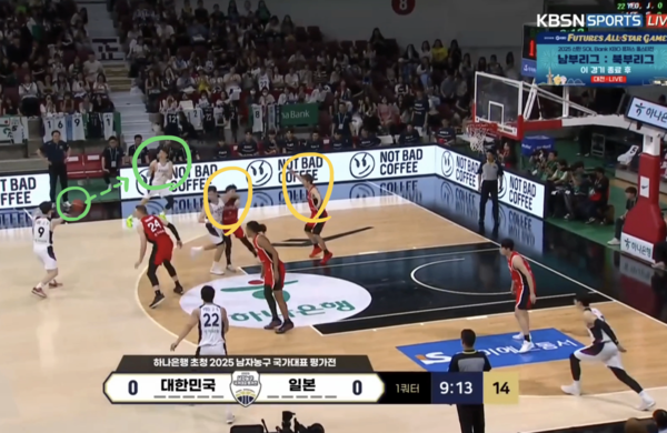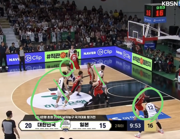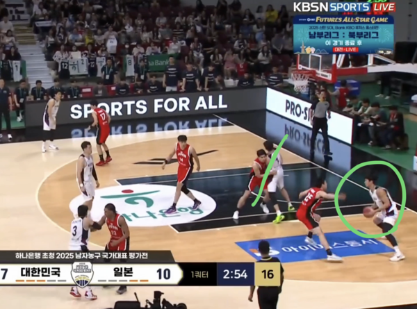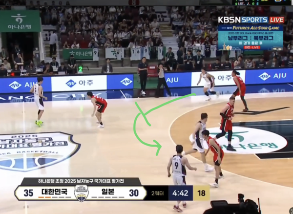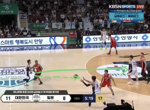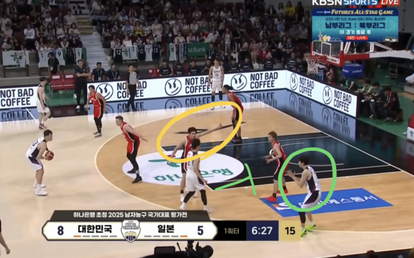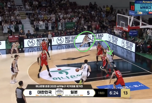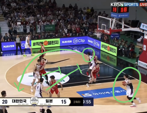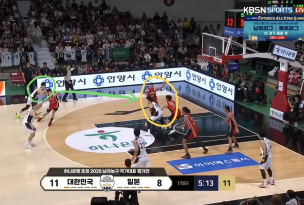 이현중이 웨이드 컷하는 여준석에게 패스를 연결한다. 여준석을 마크하고 있던 일본 수비수가 이현중의 돌파에 신경쓰느라 여준석을 전혀 체크하지 못하고 있는 것이 보인다.