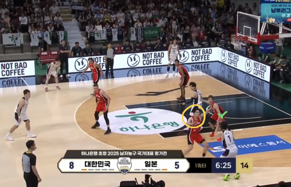 그러자 스위치 수비를 하려고 했던 일본의 윙쪽 수비수 2명이 모두 이현중과 순간적으로 거리를 두게 되는 균열 상황이 발생한다.