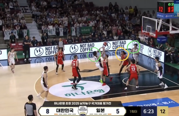 이승현이 여준석에게 플레어스크린을 건 후, 다시 이정현에게 스크린을 건다. 이에 대해 일본이 스위치 수비로 맞대응, 이승현 쪽에서 미스매치가 발생한다.