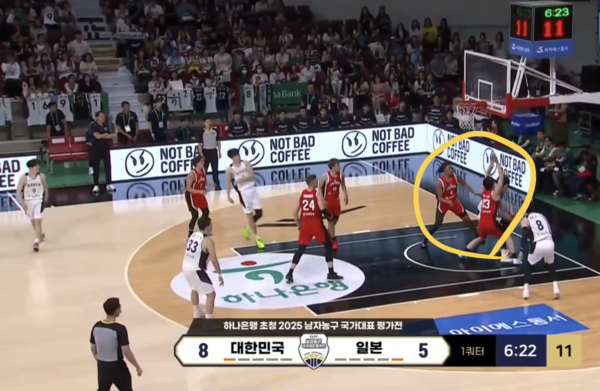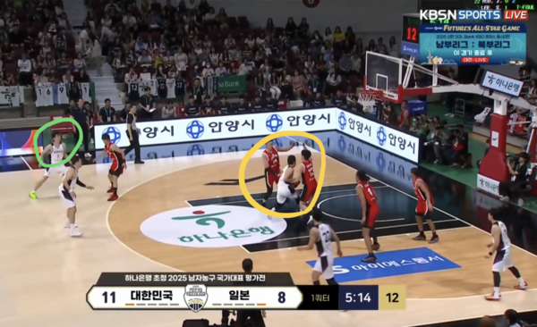 일본 수비도 끈질기게 대응한다. 여준석이 볼을 잡자 안영준을 막던 수비수와 여준석의 기존 수비수가 페인트존을 둘러싸면서 여준석의 이지 득점 기회를 차단한다.