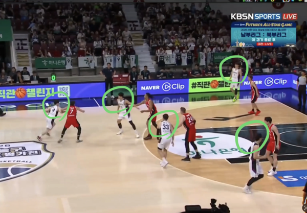 스위치가 이뤄지는 타이밍보다 이현중, 여준석이 탑으로 빠지는 타이밍이 더 빠르기 때문에 순간적으로 이현중, 여준석에게 공간이 열릴 가능성이 높다.