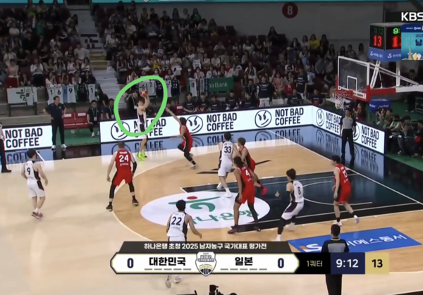 이를 읽은 이정현이 곧바로 이현중에게 패스를 연결한다. 스크램 스위치를 한 일본이 급하게 컨테스트 수비를 시도하지만, 이현중이 딥 쓰리 지점에서 볼을 잡고 있어 이미 클로즈아웃 동선이 너무 길다.