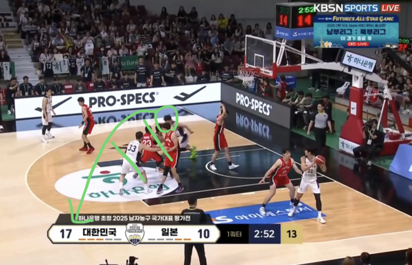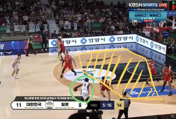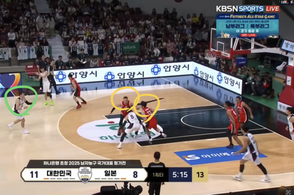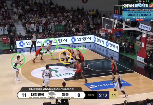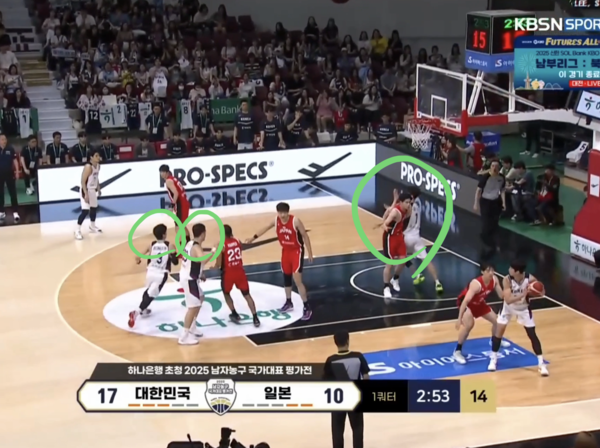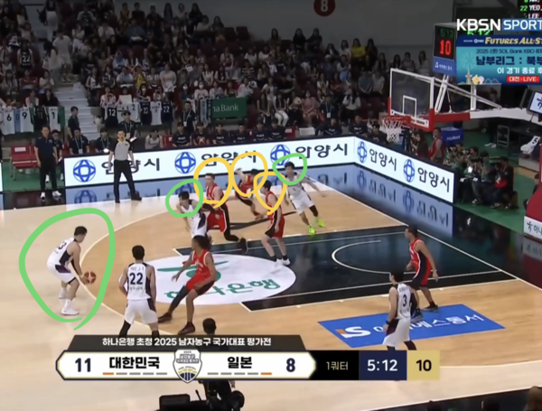 안영준이 이를 읽고 이승현에게 패스하고, 이 순간 일본 수비수 3명이 안영준과 이현중에게 몰려 있는 것을 알 수 있다.