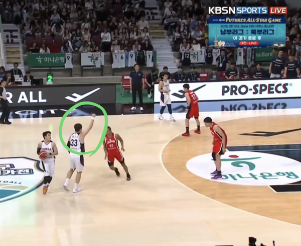 실제로 위 장면을 자세히 보면 이현중을 마크하던 수비수가 이승현에게 붙어 있는 수비수에게 손짓(이현중을 스위치로 체크하라는 뜻)을 하는 것이 보인다.