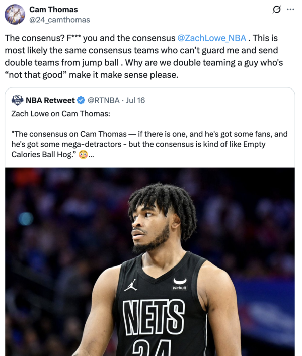 "캠 토마스에 대한 대체적인 평가를 말해볼게. 토마스를 좋아하는 팬들도 있고 강하게 비판하는 사람들도 있어. 하지만 (관계자들 사이의) 대체적인 시선은 토마스가 영양가 없는 볼 호그라는 쪽이야.(The consensus on Cam Thomas — if there is one, and he's got some fans, and he's got some mega-detractors - but the consensus is kind of like Empty Calories Ball Hog.)"