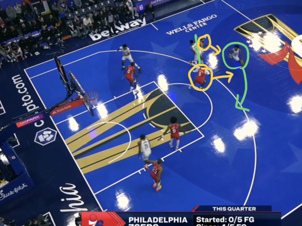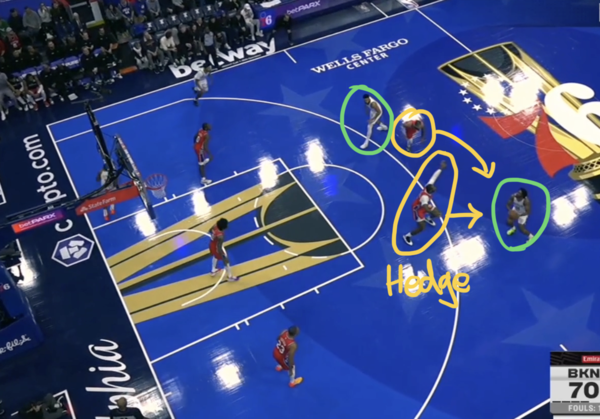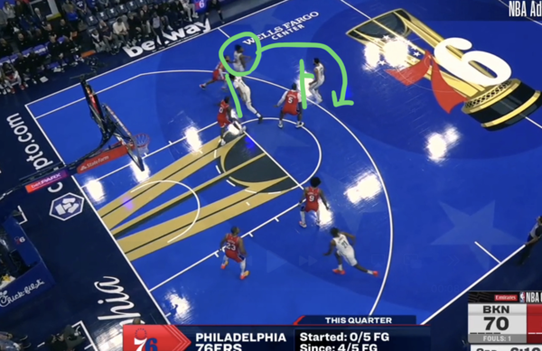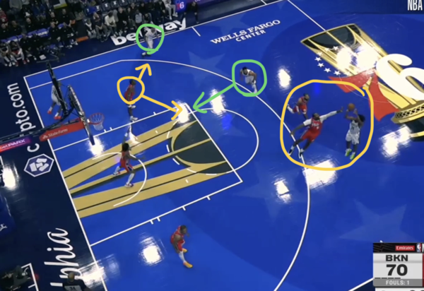 두 번째 스크린을 걸어줬던 벤 시몬스가 안으로 짧게 롤할 수 있고, 이로 인해 오른쪽 사이드의 상대 수비수가 시몬스의 45도의 브루클린 슈터 2명을 체크해야 하는 1대2 상황(겟투)이다.